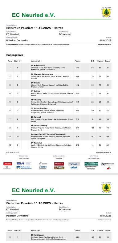 Die Gastgeber vom EC Neuried starteten stark: Mit einem Auftaktsieg setzten sie sich gleich auf Platz 2 und führten nach dem dritten Durchgang sogar mit 6:0 Punkten das Feld an! Bis zum siebten Durchgang wechselten sie immer wieder zwischen Platz 1 und 2, ehe sie im achten Durchgang auf Platz 3 „abrutschten“. Am Ende reichte es zwar „nur“ zu Platz 6, doch mit 11:9 Punkten war das Ergebnis deutlich stärker als im Vorjahr – ein klarer Aufwärtstrend!