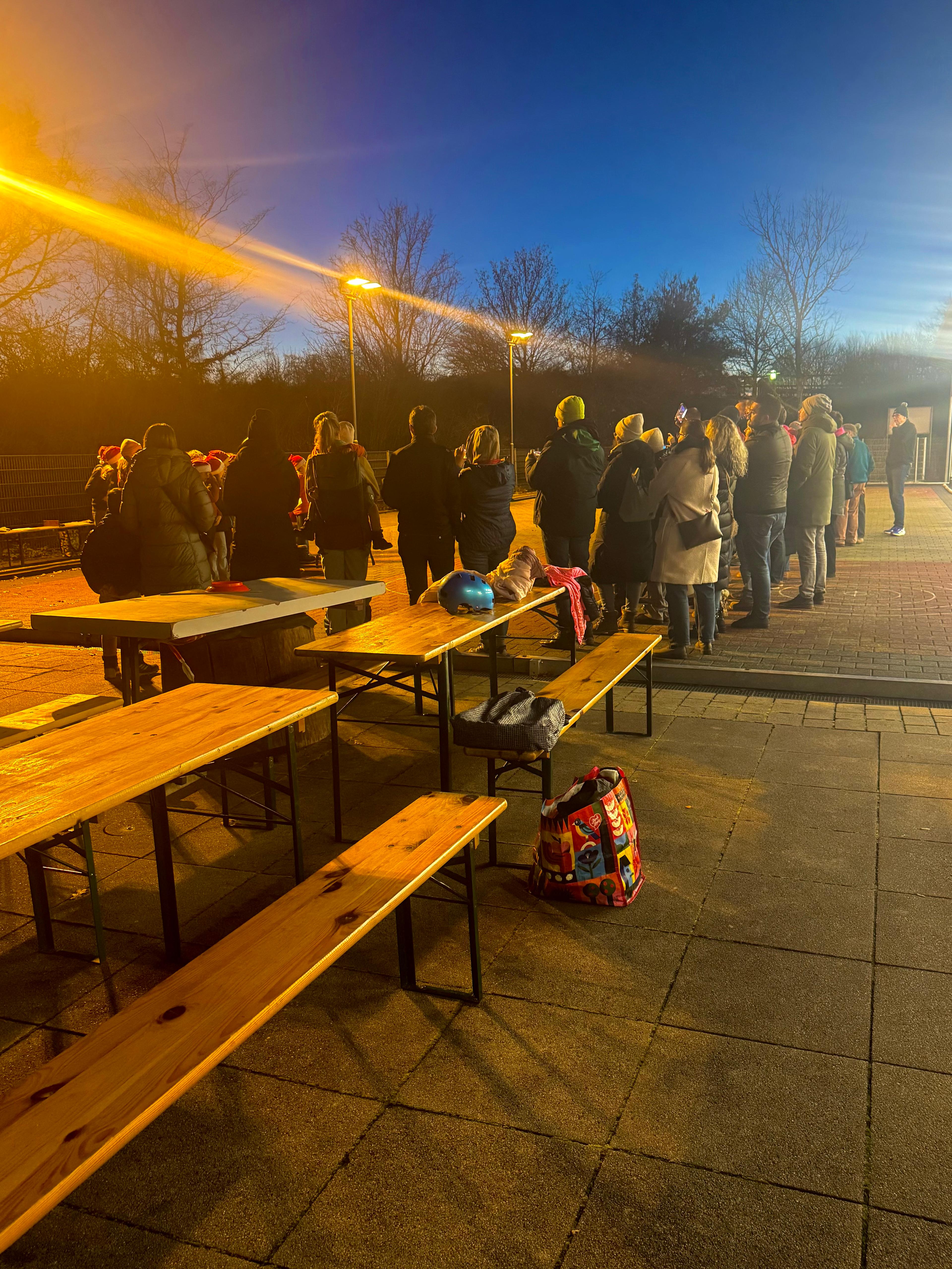 Zwischendurch lockte die kulinarische Hauptstation: Für die Eltern gab es Glühwein – rein medizinisch, zum Aufwärmen natürlich – und für die Kinder Kinderpunsch in allen Schattierungen von „heiß“ bis „vorsichtig pustbar“. Die Tafel glich einem Buffet: Butterbrezen, belegte Semmeln, Snacks, Lebkuchen, Mandarinen – und noch viel mehr, das im allgemeinen Gewusel unsichtbar blieb, aber garantiert aufgegessen wurde.
