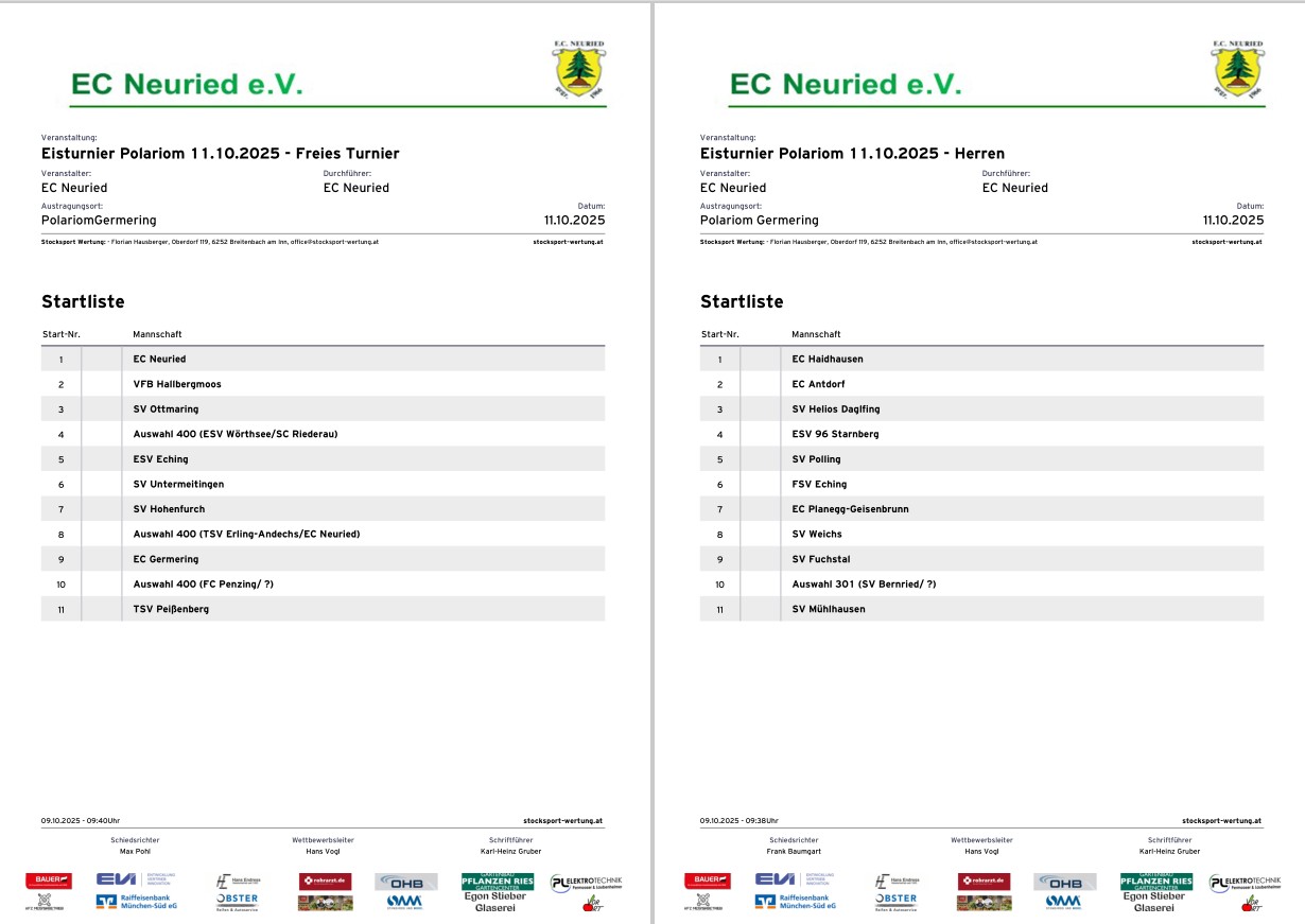 Noch 2 Tage, dann startet unser großes Turnier im Polariom Germering. Aktuell sind je 11 Mannschaften im Herren- und im Freien Turnier am Start – Beginn 06:15. Schon extrem früh, leider haben wir die Eisbahnen nur bis 13:30. Beider Turniere finden parallel statt.