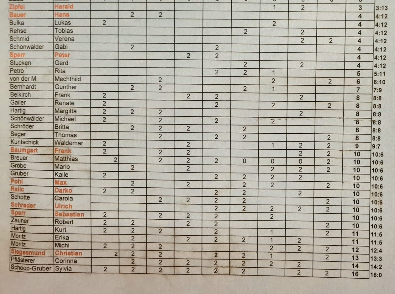 Das gesamte Ergebnis: viele Spieler waren punktgleich – es wurden keine Stockdifferenzen berechnet. Die Mannschaftsführer sind in der Ergebnisliste rot beschriftet.